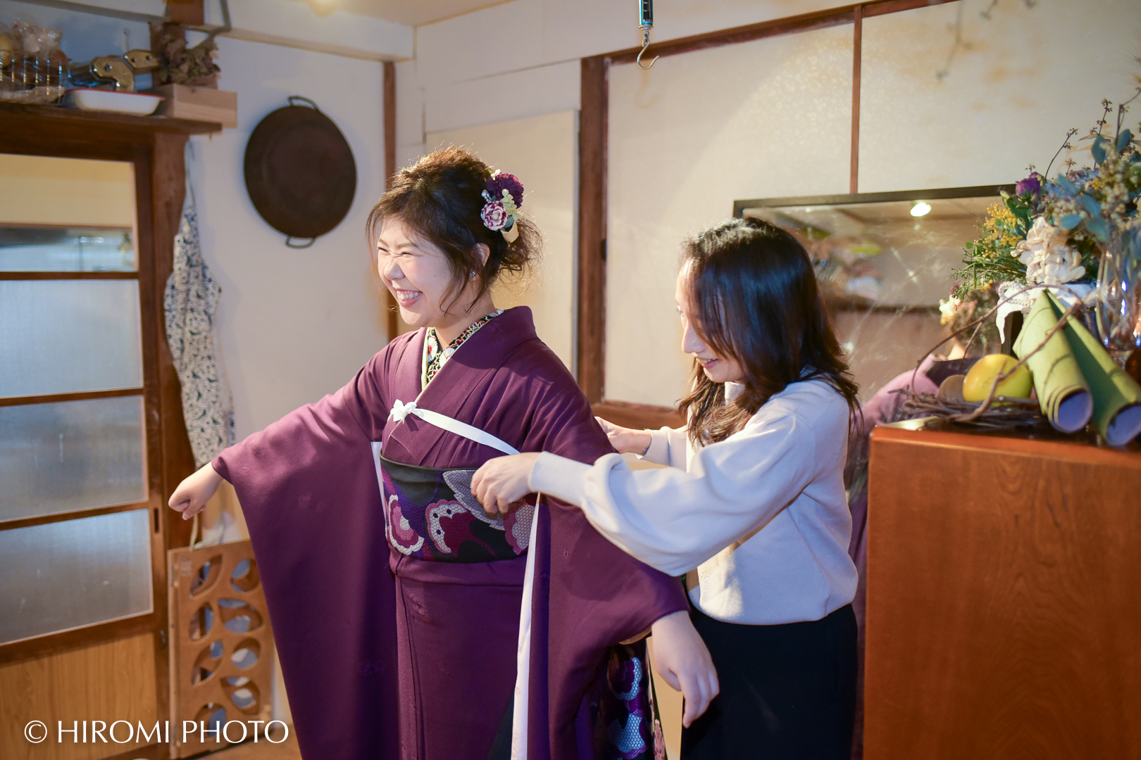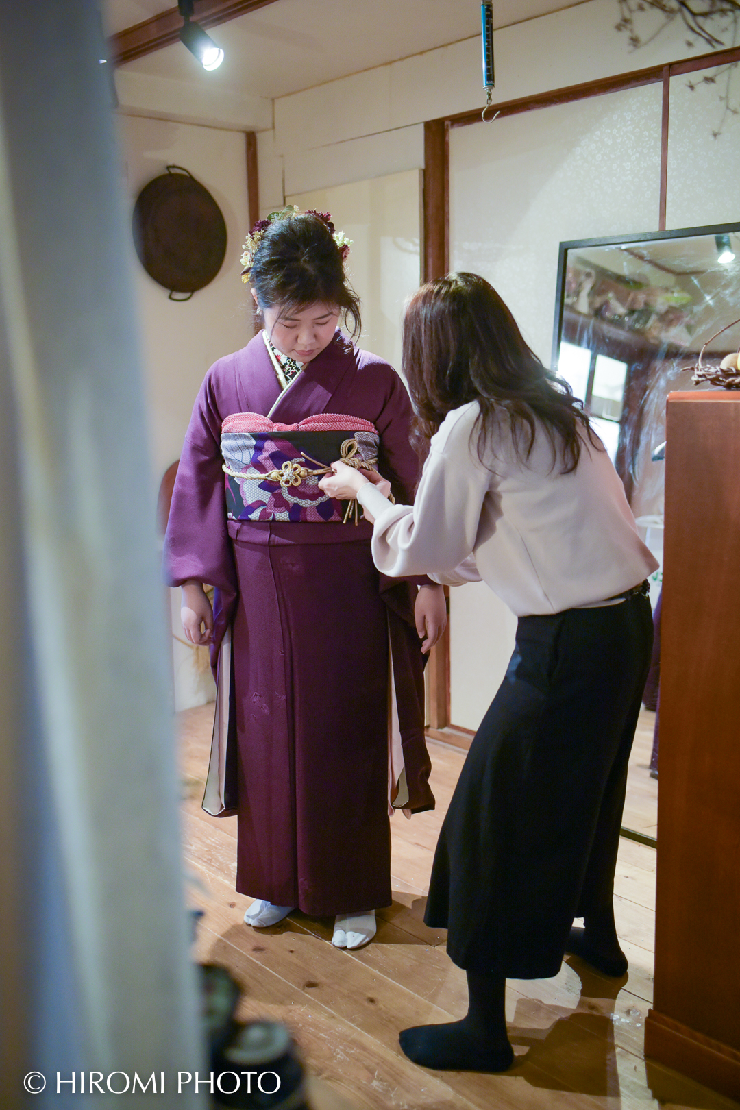お着物を綺麗に整えるだけでなく、美しい所作のアドバイスや、現場を明るく盛り上げてくださるムードメーカーとしての存在に、私もいつも助けられています。