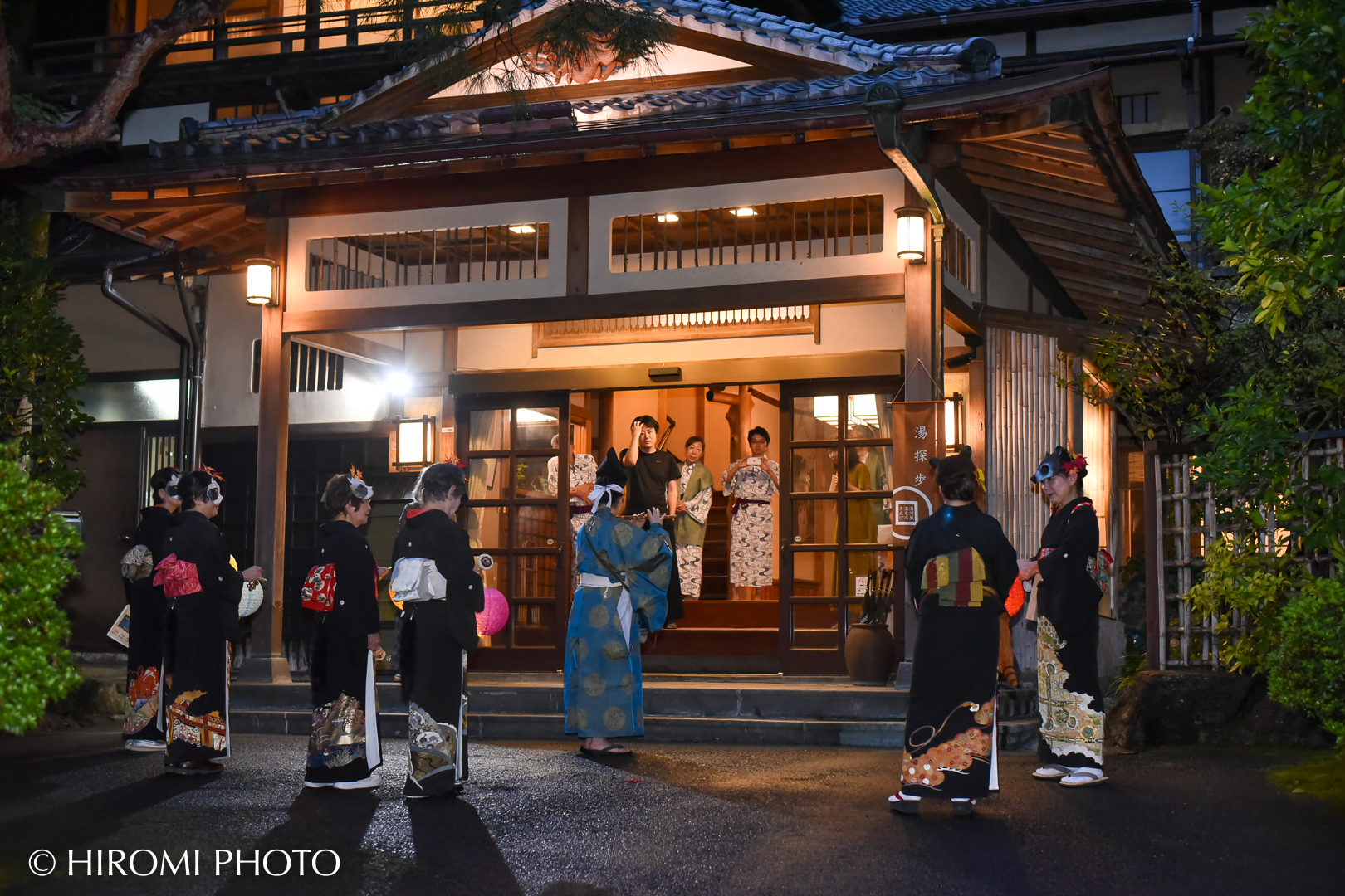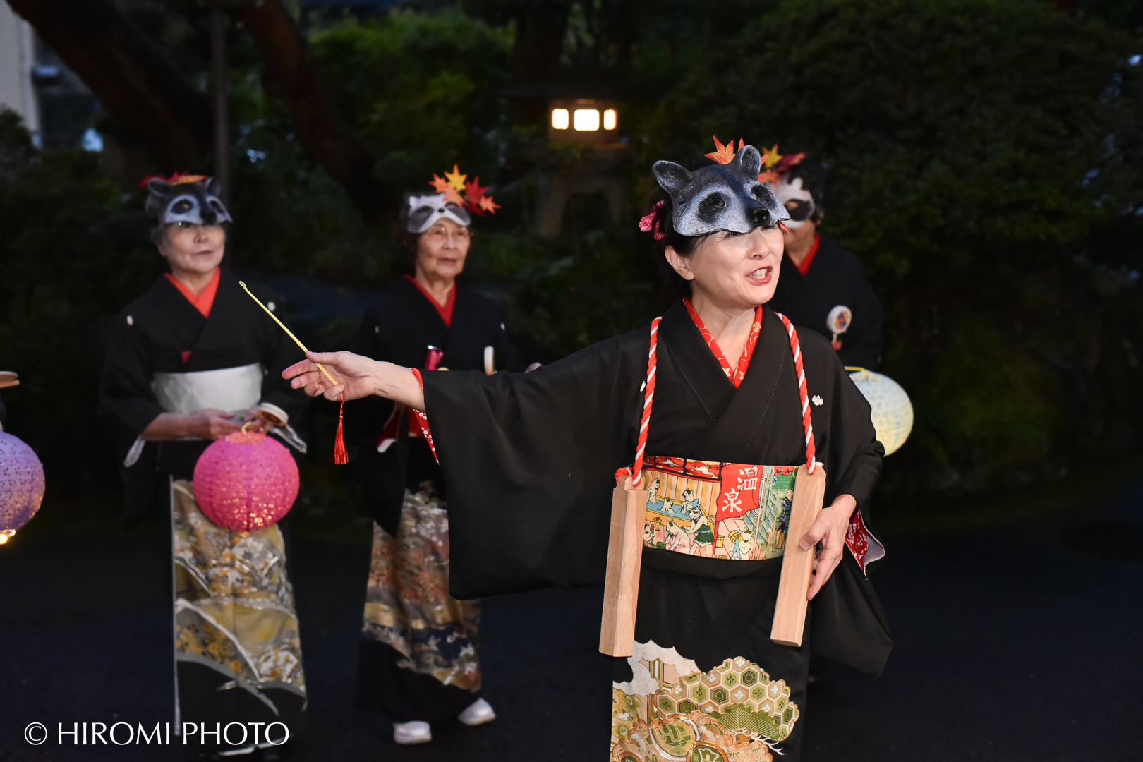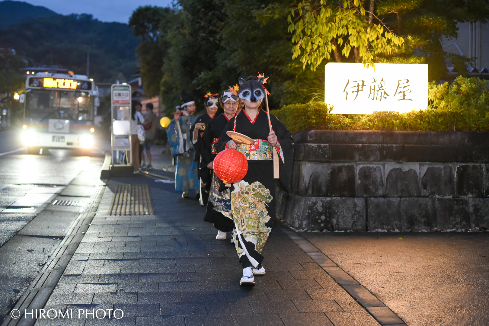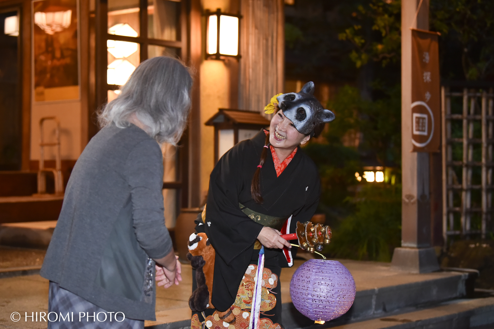 たぬきの行列は、18時頃八亀庵を出発し、近隣の老舗旅館にお泊りのお客様にご挨拶をしながら湯元通りへ。