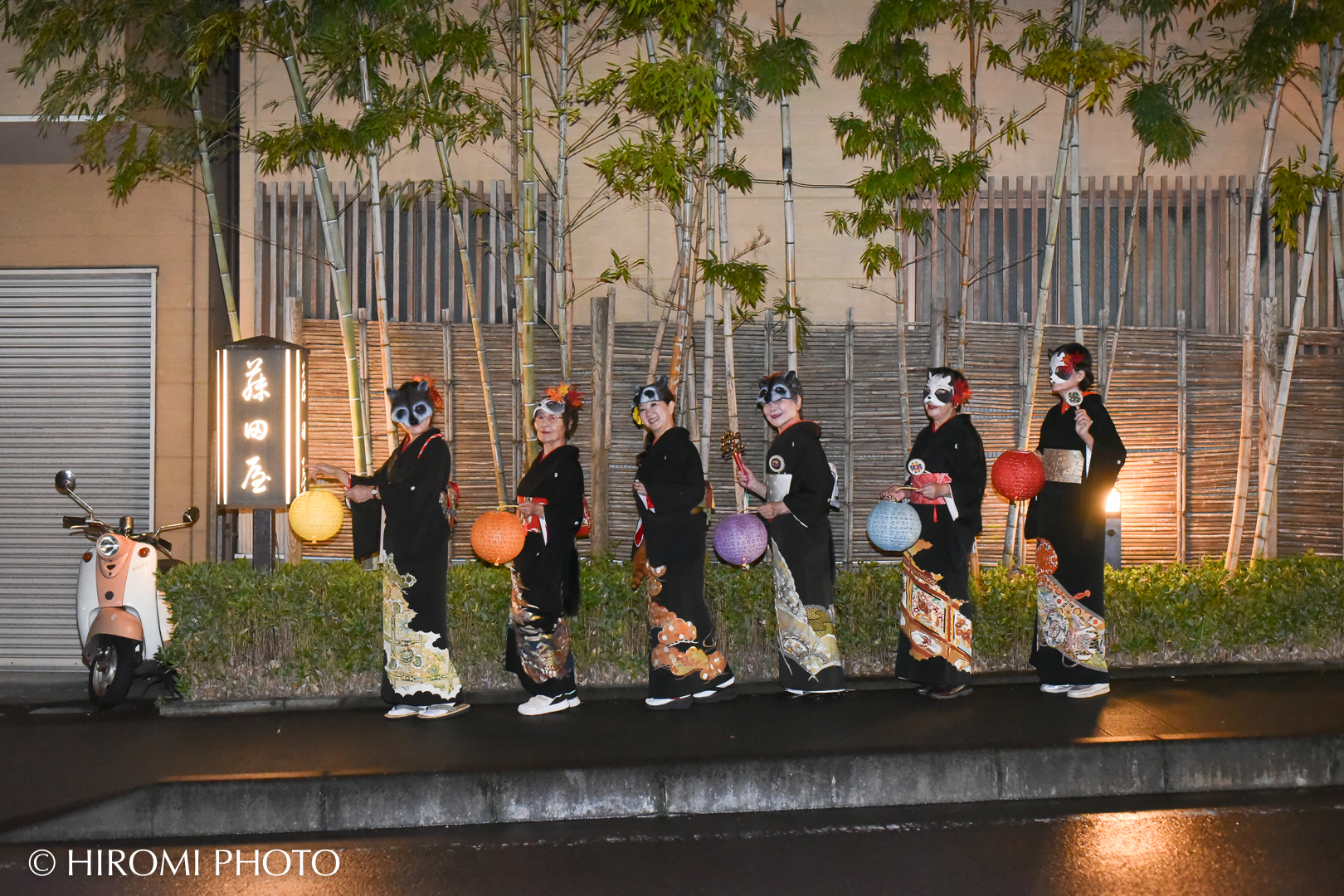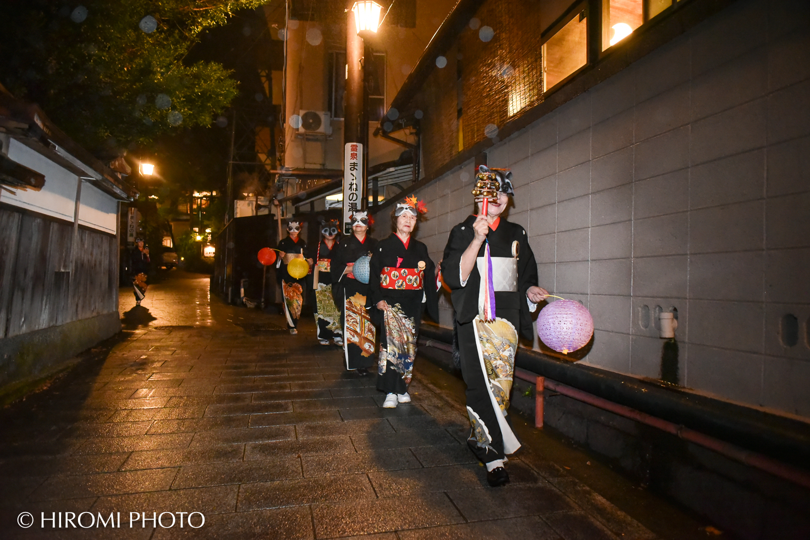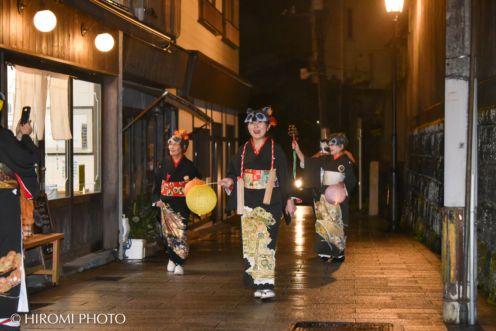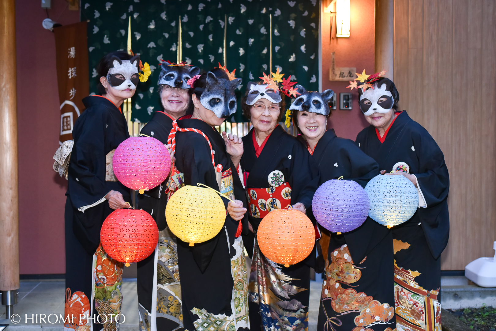 たぬきの行列は、18時頃八亀庵を出発し、近隣の老舗旅館にお泊りのお客様にご挨拶をしながら湯元通りへ。