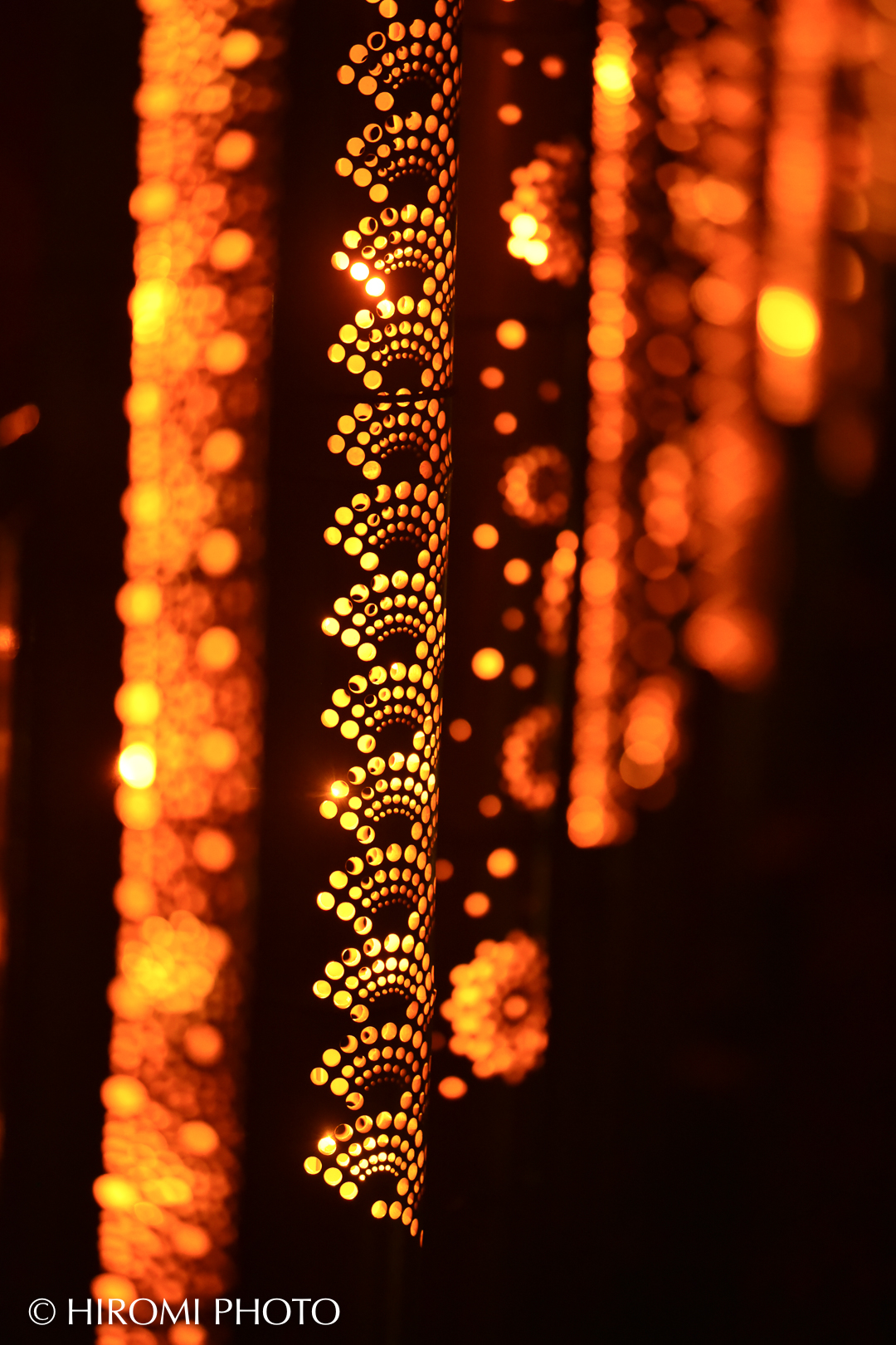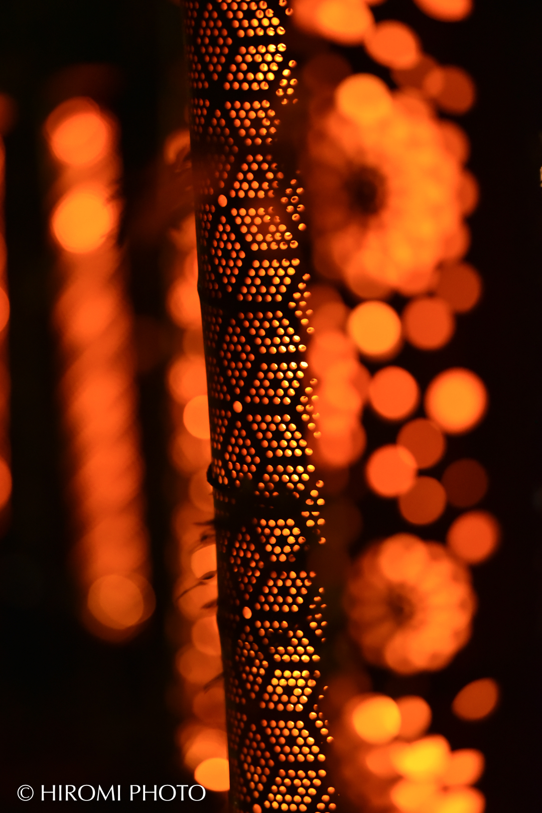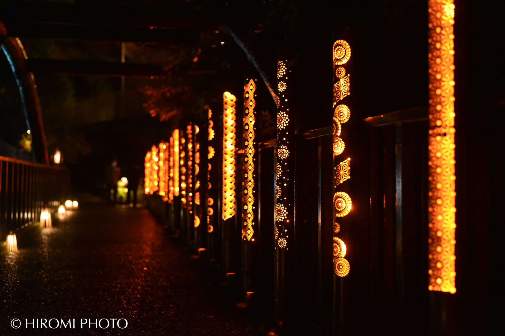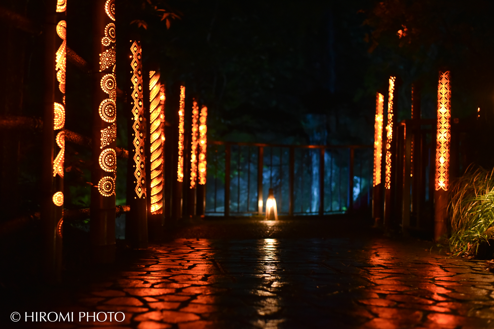 万葉の竹あかりは、万葉公園内の滝周辺の遊歩道を中心に、様々な飾り彫りが施された竹燈籠が配置されていました。