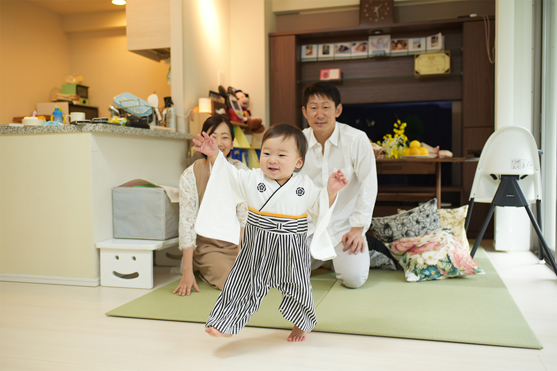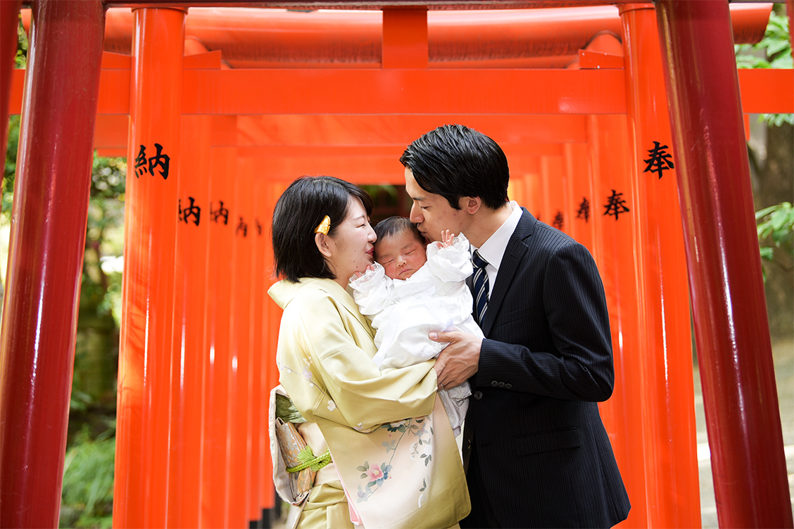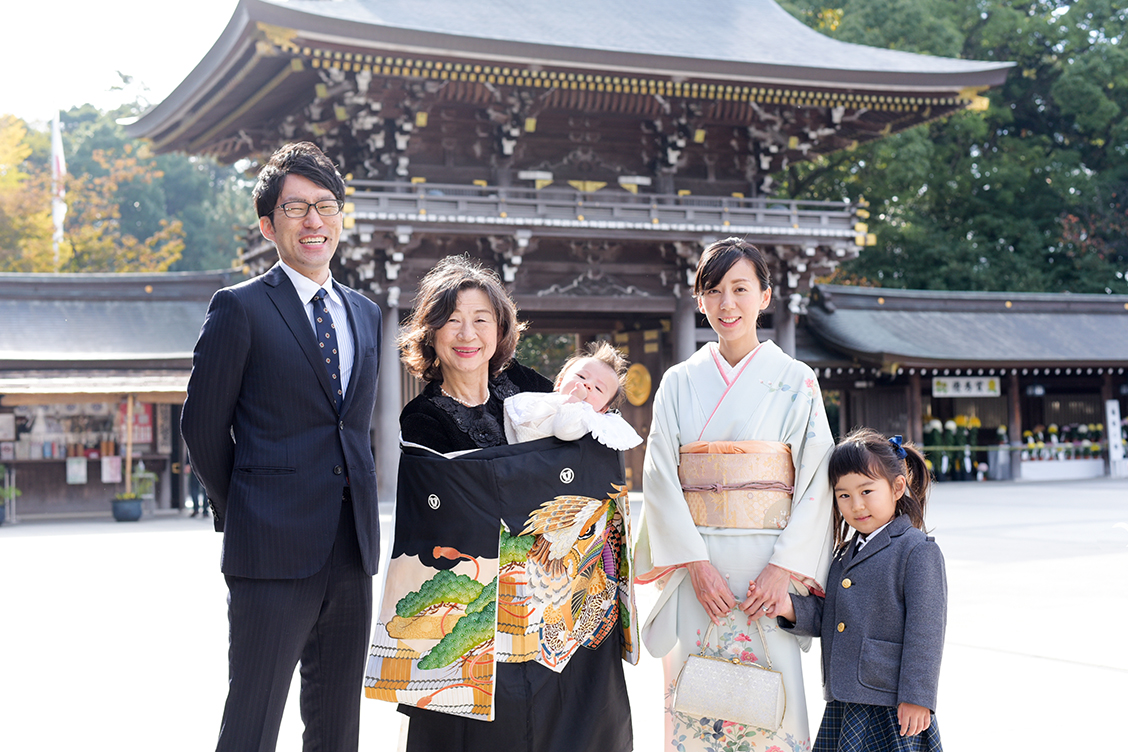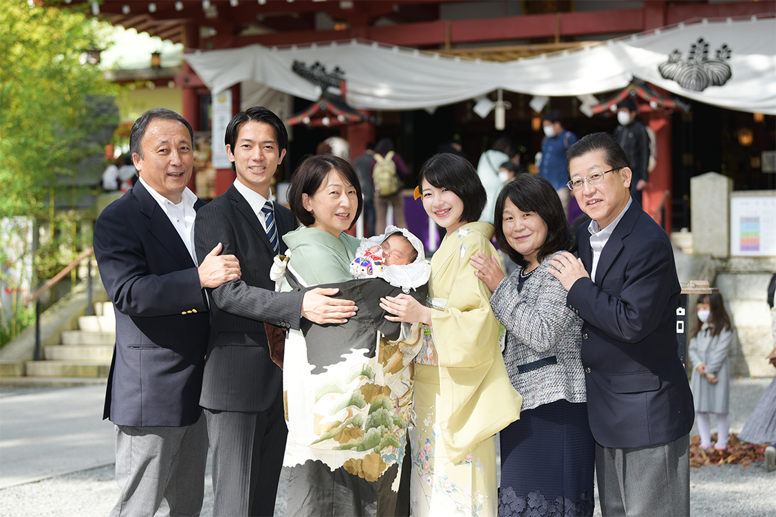 神社境内でのご祈祷前後の様子や、ご家族皆様での集合写真はもちろん、ご自宅やご実家がお近くでしたら、赤ちゃんのお着替えシーンや授乳シーン、お祝いのお食事風景なども撮影可能です。