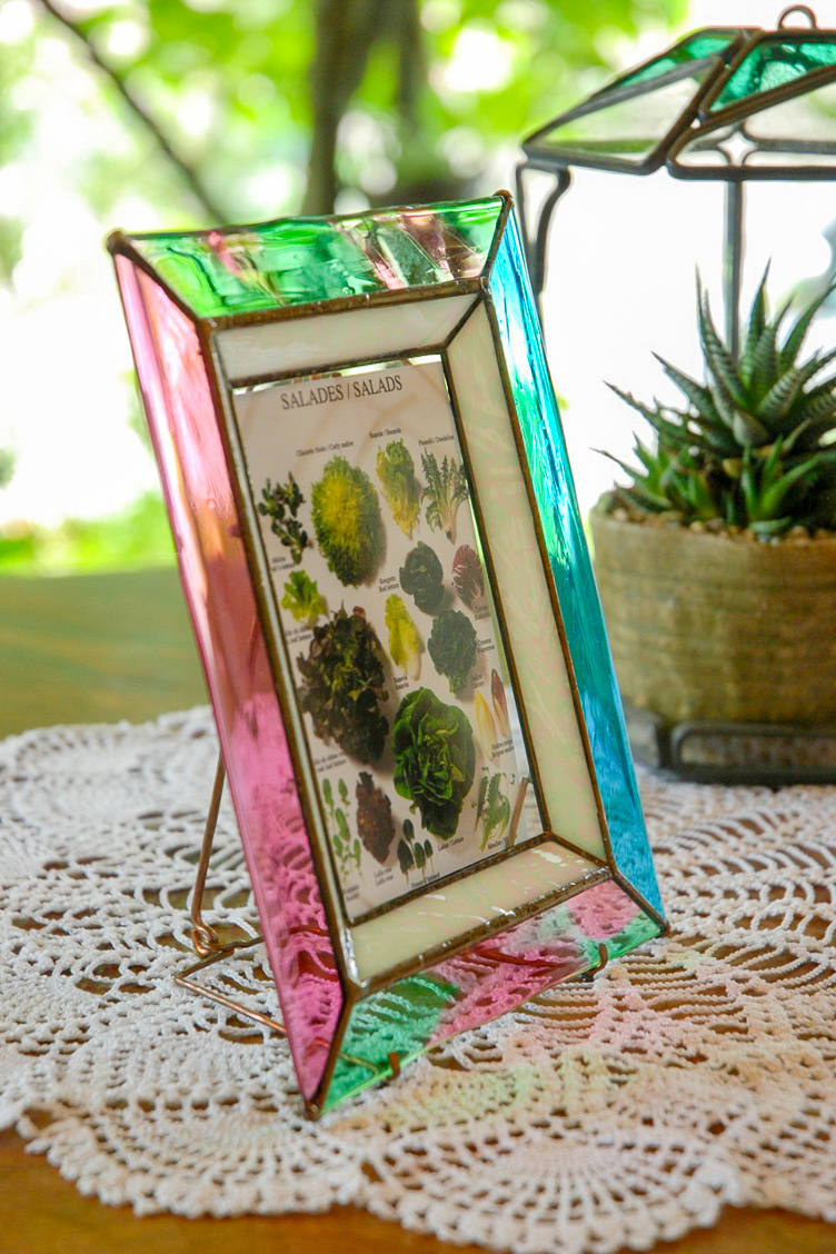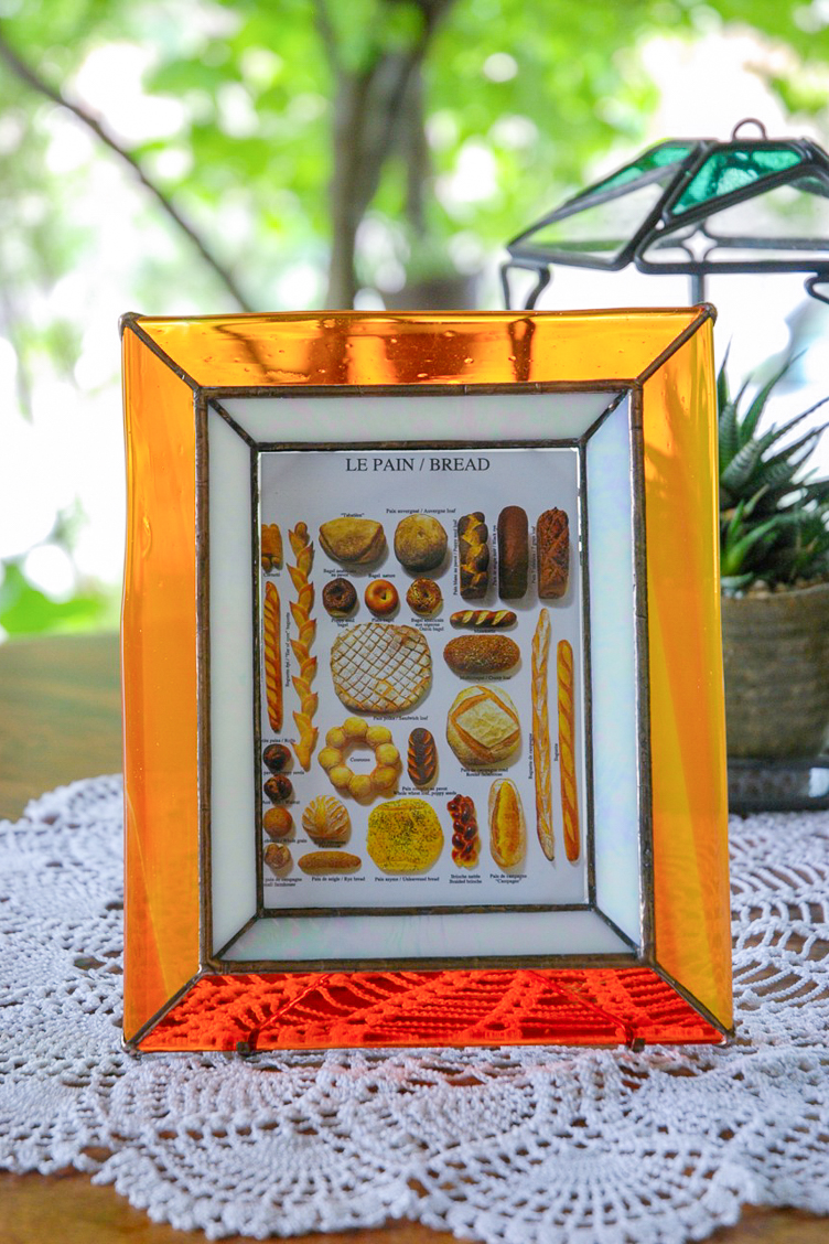通常、ランバーツ社の吹きガラスを使用したステンドグラスのフォトフレームは高価ですが、大きな作品を制作する際に生まれる端材を有効活用することで、特別価格でのご提供が可能となりました。